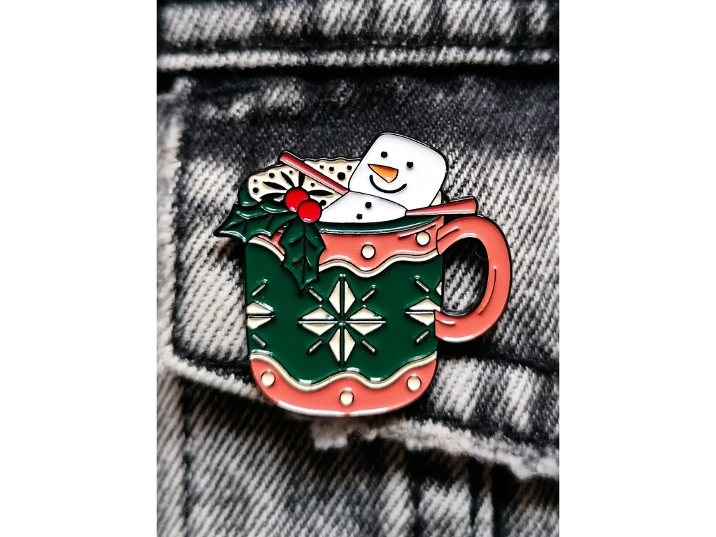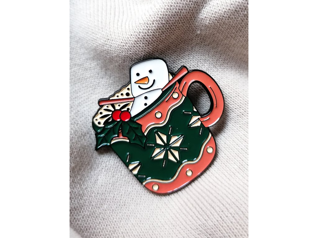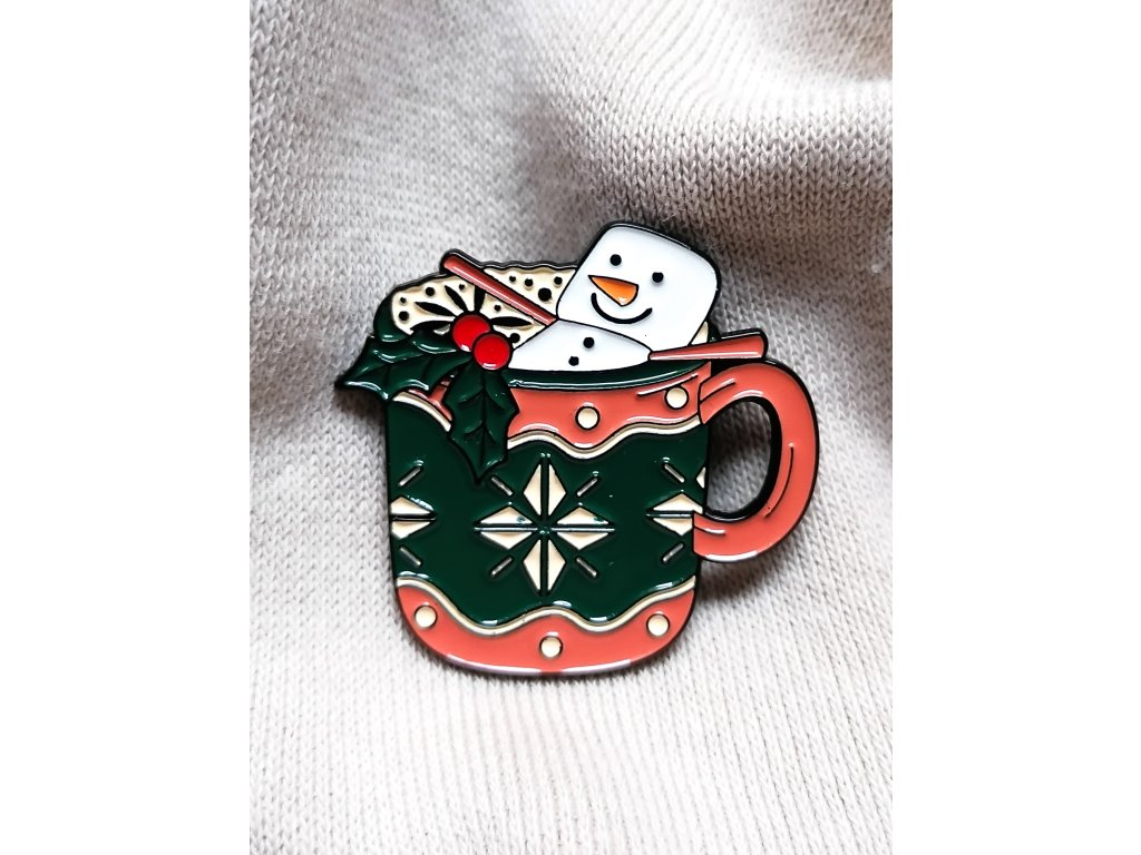 Horká čokoláda se šlehačkou, vánoční zdobení a pan Sněhulák z pěnových bonbonků užívající si svou sladkou koupel. Ponoř se s námi do kouzelné vánoční atmosféry připnutím tohoto lahodného tematického kousku.